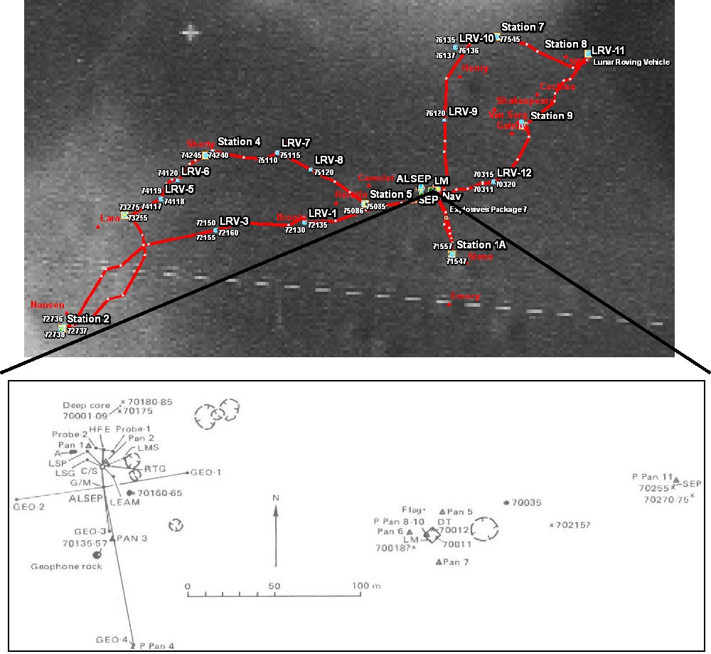 Station 0 includes the area around the Lunar Module (LM). It also includes the areas where the astronauts deployed the Apollo Lunar Surface Experiments Package (ALSEP) and the Surface Electrical Properties Experiment (SEP). The ALSEP was deployed approximately 185 meters west-northwest of the LM and included the Lunar Seismic Profiling, Heat Flow, Lunar Surface Gravimeter, Lunar Ejecta and Meteorites, and Lunar Atmospheric Composition experiments. The SEP was deployed about 120 m east of the LM. Other activities included sample collection, a deep core sample, traverse gravimeter measurements, deployment of the Lunar Neutron Probe and Cosmic Ray Experiments, and photography.