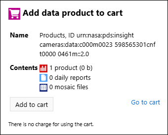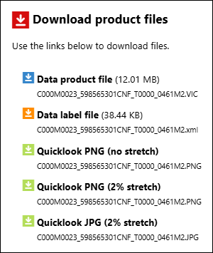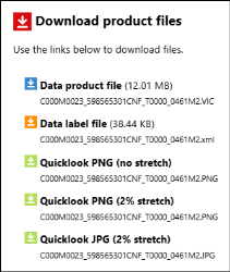 Download the current data product. For images, additional formats are usually available, such as JPG and PNG. The example below lists the data file, label file, and three browse (quicklook) files that can be downloaded for a given image. Note that in this case, three of the browse images are created by the Notebook from the archived data product. When available, browse images by the instrument team will be shown.