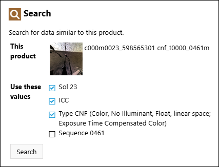 Open a new data search using some of the same attributes as the current item, such as instrument, sol, and location.